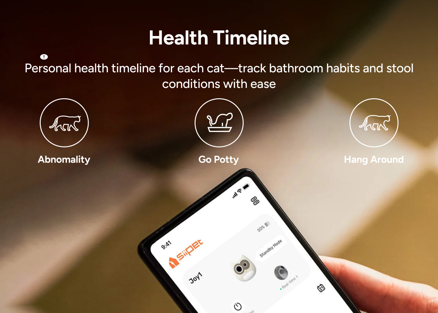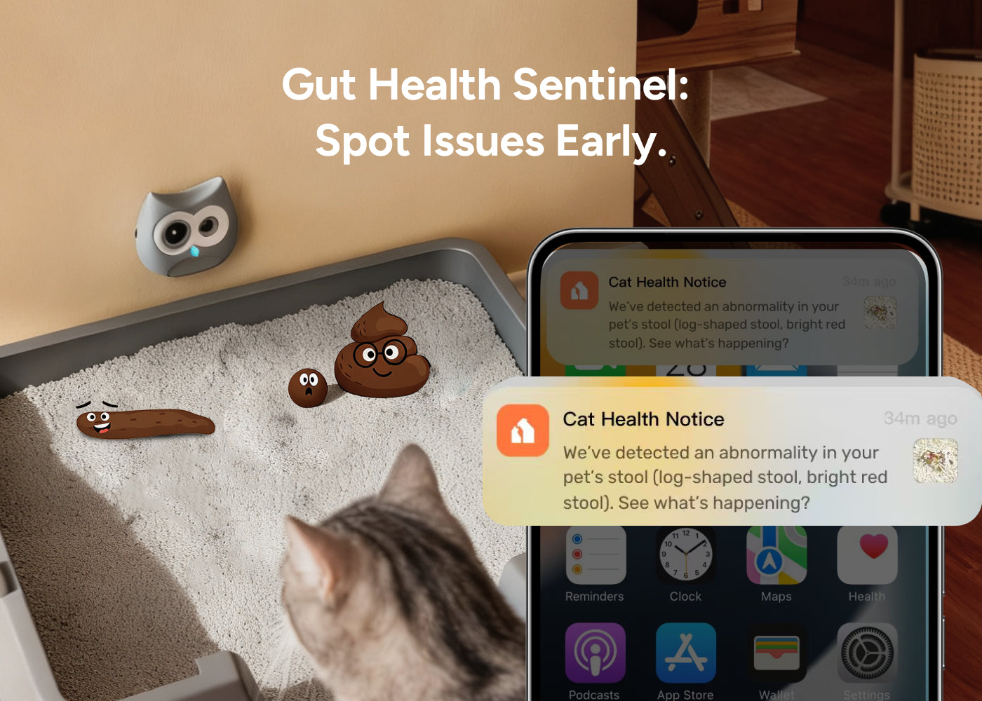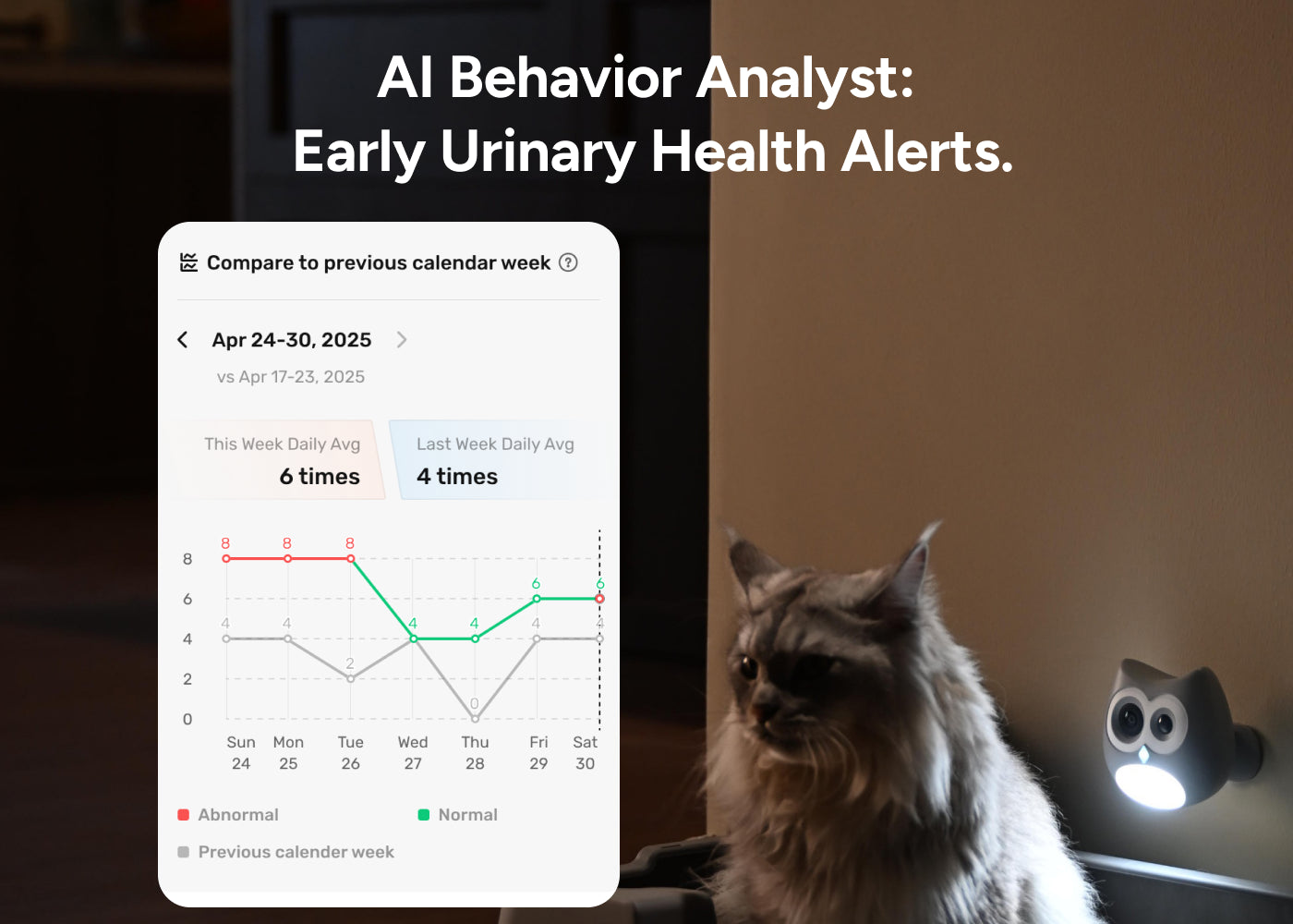AI tracks litter box visits and spots abnormal patterns (e.g. frequent entry, long stays, painful posture). Sends instant alerts—early warnings for urinary issues so you can act fast.