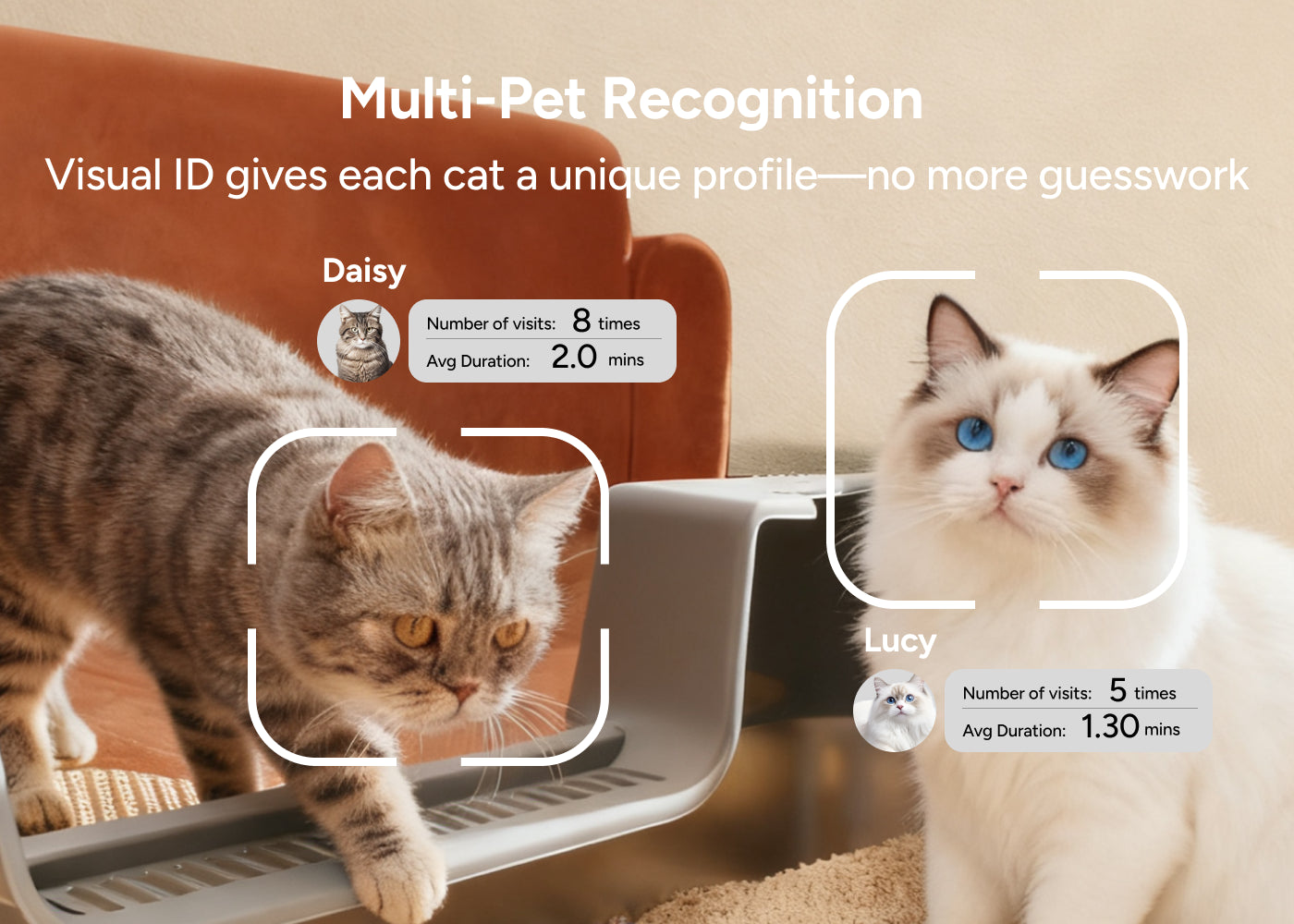 AI “fingerprint” distinguishes each cat, even with similar body sizes. Provides accurate health tracking for multi-cat homes.