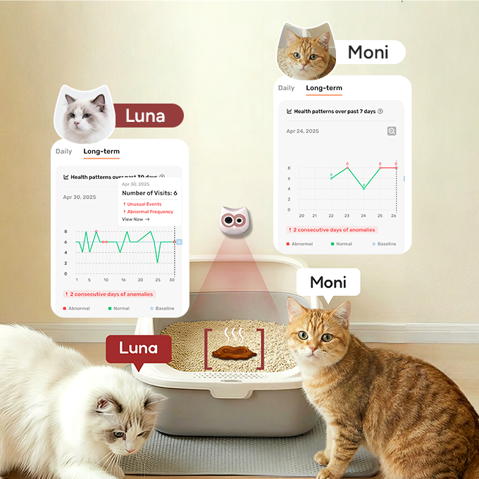 In homes with multiple cats, LitterLens reliably identifies each cat after just a couple of quick labels—so every cat gets individualized monitoring and no one’s health changes go unnoticed.
